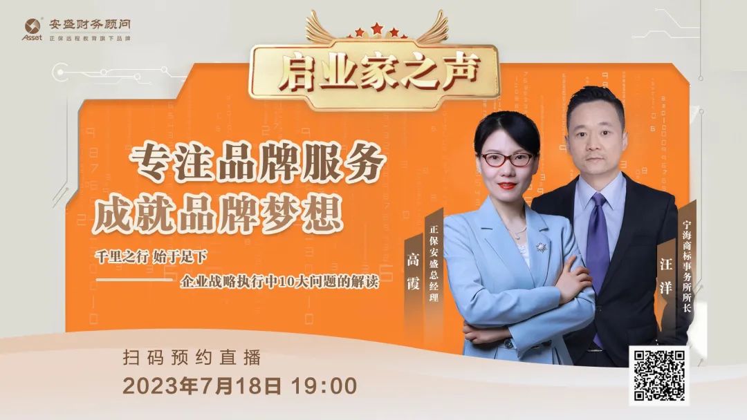 7月18日19:00,正保安盛財(cái)務(wù)推出《啟業(yè)家之聲》第三期:《【專注品牌服務(wù) 成就品牌夢想】千里之行,始于足下——企業(yè)戰(zhàn)略執(zhí)行中10大問題解讀》的直播訪談節(jié)目,邀請安盛總經(jīng)理高霞女士和寧海商標(biāo)事務(wù)所所長汪洋先生親臨對話,直播間一起討論如何搭班子、定戰(zhàn)略、帶團(tuán)隊(duì),如何做好人才管理、服務(wù)升級、品牌刷新……這些問題是企業(yè)管理中至關(guān)重要的因素,也是很多企業(yè)普遍存在的現(xiàn)象,所謂老板和員工的必聽課。